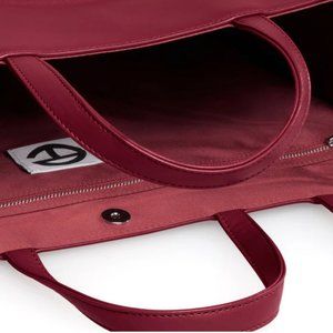 Featuring a double strap (handles and cross-body straps), embossed logo, a main compartment with magnetic snap closure, internal laptop-sized compartment with zipper closure in back and additional internal pocket in front. Made from faux leather and twill lining. Bag is packaged in a drawstring bag with screen-printed logo.