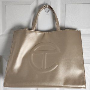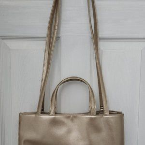 Double strap (handles and cross-body straps), embossed logo, a main compartment with magnetic snap closure, and internal zipper pocket. Dust bag included.