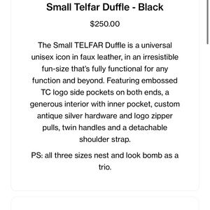 Like new Telfar Small Duffle in Black, with all accessories (cross body strap and dust bag).Excellent, like new condition, worn twice. Great brand. No trades.