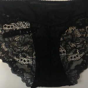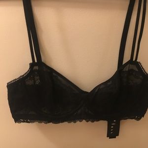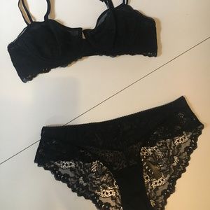 Never worn black lace underwire bra from TellTale, plus matching panties. Pretty lace detail. Panties a size medium. Set retails for $68 + tax new. Items come with tags still attached.