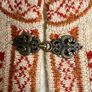 Features rich warm tones, traditional Fair Isle patterns, and beautiful antique-style metal clasp closures—a timeless piece with Little Women, Nancy Meyers, and quiet luxury cottagecore vibes.
