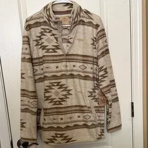 Stylish sweater with intricate patterns. Features shades of brown and cream.