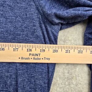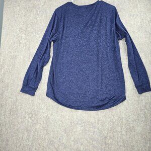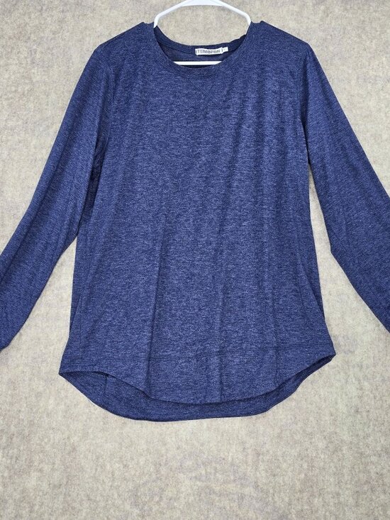 Lightweight top, crew neck, heathered blue, women's casual wear, rayon blend, machine washable, rounded hem, cuffed sleeves, versatile wear, stretchy top, breathable fabric, casual layering, long-sleeve women's shirt, size Large