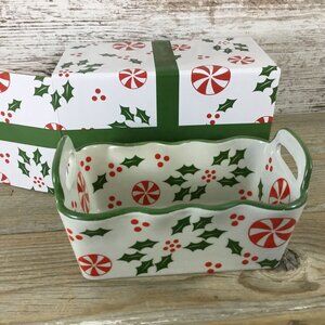 Durable ceramic loaf pan decorated with festive holly and peppermint patterns. Includes original box, ideal for baking or gifting this holiday season.