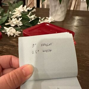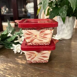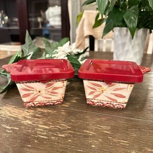 2 piece - Individual square bakers with handle and lids. The baker or casserole dish is ceramic and the lid is plastic. Perfect fitting. The casserole dishes are old world cranberry motif by Temp-Tations.