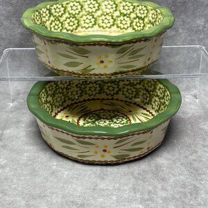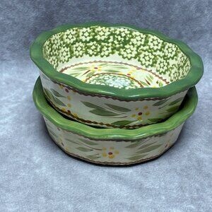 Set of two 5 inch Temp-Tations Old World bowls with vibrant green floral design. Oven, microwave, and dishwasher safe; perfect for serving or baking.