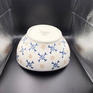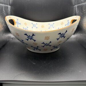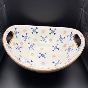 Temp-Tations Oval Ceramic Serving Bowl Handles Blue Gold Atomic Floral Pattern