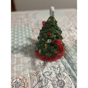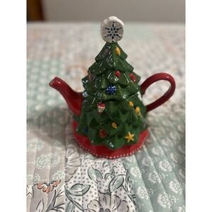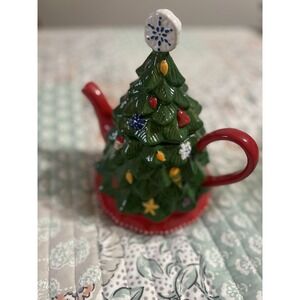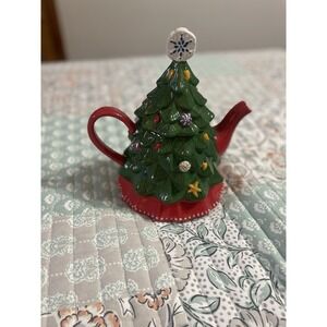 The Temp-Tations by Tara Winter Whimsie Christmas Tree Teapot is a festive and charming ceramic teapot perfect for serving holiday tea. With a green and red color scheme, this glazed teapot features a whimsical Christmas tree design, adding a touch of magic to your dining or kitchen. This teapot is ideal for hosting gatherings or enjoying a cozy tea party during the holiday season.Condition and size in photos.