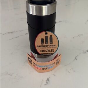 Stylish black can cooler by Tempercraft. Features a sleek design with stainless steel