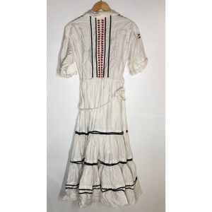 ~ Description: White printed. Hourglass. Short sleeves. Shirt collar. Exposed button closure. Bodice and skirt lined. 100% Cotton. Imported.
