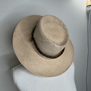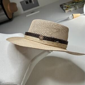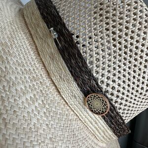 Temple Tan & Brow Basket Weave Rattan Wide Brim Hat Embellished Band