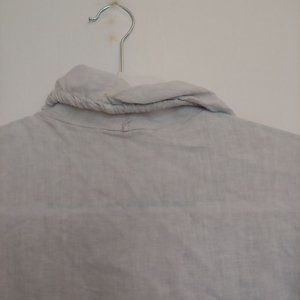 Color is cloe to cement. Long sleeves can be worn down or buttoned up. Has 2 pockets. Collar has a drawstring and the hem has a drawstring to tighten. Lightweight. Pit to pit 22". Length 34"