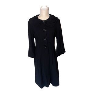 Absolutely gorgeous and in 1960’s retro fashion Gloria. Trench style coat with large buttons have way down the front. The balloon sleeve cuffs and collar offer a prom and proper look, while the slim fit and black color give it chic appeal. This coat is absolutely gorgeous on! Has side pockets and is medium weight, perfect for the transitioning seasons! Polyester/spandex blend. Measurements in pictures. Feel free to ask questions!