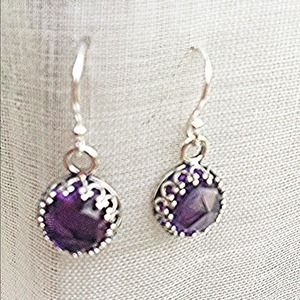 Beautiful sterling silver earrings with genuine purple amethyst. They dangle no more than an inch. The amethyst is 8mm around and rests gently in a sterling silver crown setting.