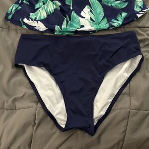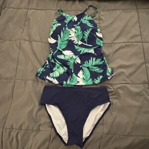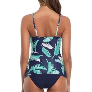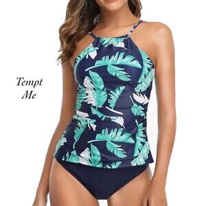 Tempt Me Blue Green Palm Leaf High Neck Ruched Tankini Bathing Suit NWT Size L