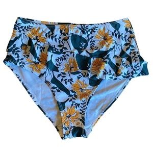 High waisted bottoms, white with floral print and flattering ruffle across the tummy area.