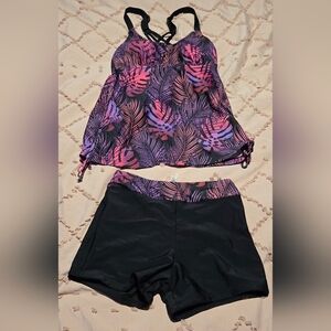 •The Purple Leaves tankini swimsuit comes with shorts, removable padded bra, adjustable wide shoulder straps, and an athletic style.