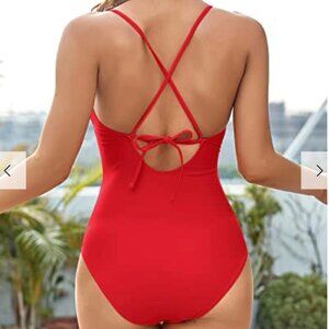 one piece swimsuit, red bathing suit, women's swimwear, summer beachwear, v neck swimsuit, cross back straps, XL swimsuit, emerald swimwear, adjustable straps, women's bathing suit, ruched swimsuit, tummy control swimwear, professional swimwear