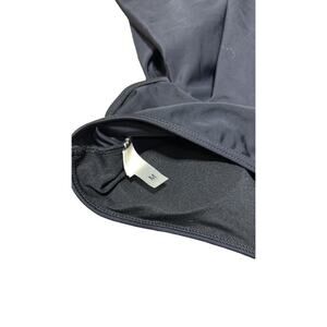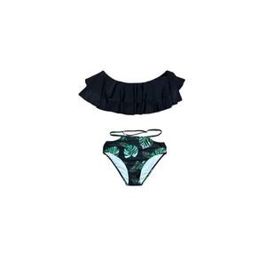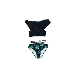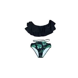 Medium bikini with extra detail around waist size medium 85% polyester 15% spandex. Black with green palm leaves. Flattering top. Ruffles. Comes with pads. Can wear with shorts/jeans