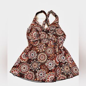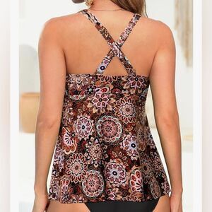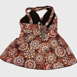 Stylish tankini top with a vibrant floral pattern. Features a mix of red, pink, and brown hues.