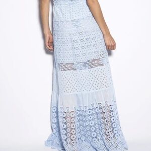 Temptation Positano's Blue Gemelli Dress is a 100% cotton floor-length dress. Featuring a puckered bandeau top and layers and layers of alternating lightly sheer lace patterning, this dress is enchanting and sexy in that understated way that we love. Created on the Amalfi coast, the brand has drawn its main source of inspiration from the striking Positano, Italy.