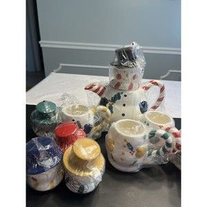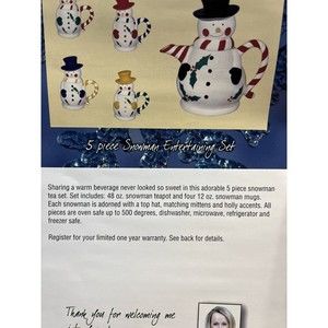 Temptations 5-Piece Snowman Entertaining Tea Set NIB. 48oz Teapot & 4 12oz Mugs