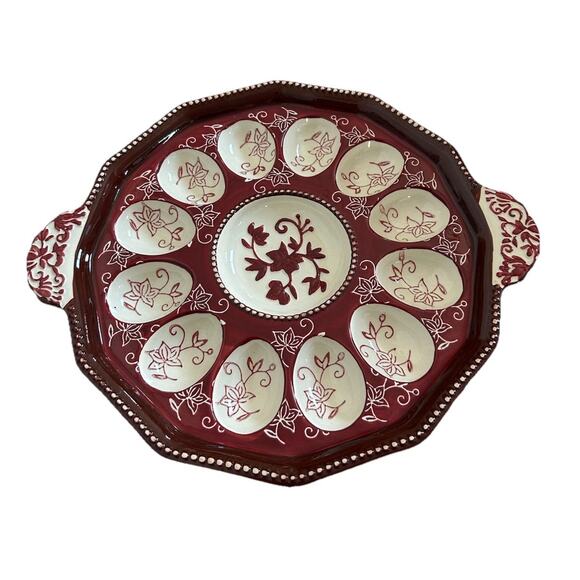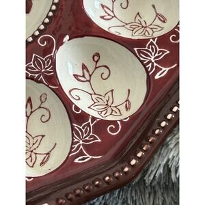 Temp-tations Deviled Egg Tray Red Platter Floral 13.5” Maroon 12 Eggs Dish Tara