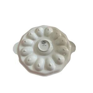 The Temp-tations Deviled Egg Tray Red Platter is a beautiful and practical addition to any breakfast or brunch table. Featuring a floral lace pattern and a maroon color, this ceramic egg platter has 12 compartments to hold your deviled eggs. The round shape and glaze finish add a touch of elegance to the dish, while the handles make it easy to transport. With a diameter of 11 inches and a length of 13.5 inches, this 12 egg dish is the perfect size for serving a large group of guests.