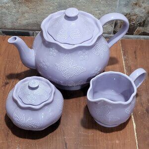 Temptations Lavendar Lilac Tea Set Teapot Sugar Bowl Creamer Embossed Butterfly