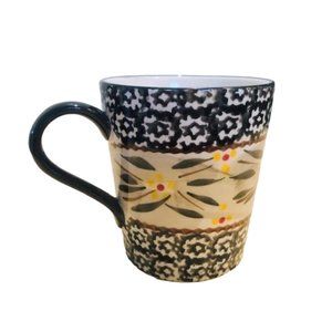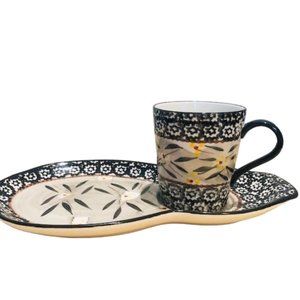 This is a two-piece cup and dessert plate set. They are ceramic and have a black and white design. They are oven, microwave and dishwasher safe. This pattern in black and white is hard to find. Plates are 11" L x 6 ¼”W. Width is at widest point. Cups are 3 ¾” H and 3 1/8” rim.