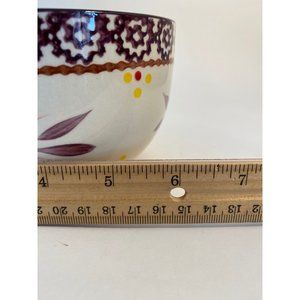 This lovely Temp-tations Coffee mug is the Old World design. It stands 3 1/4 inches tall and 5 inches wide. Holds 16 ounces of your favorite brew/tea or beverage. Has flowers inside and out, purple rim and handle. Boasts oven, dishwasher, and microwave safe. Beautiful condition with no chips or cracks.