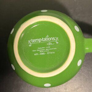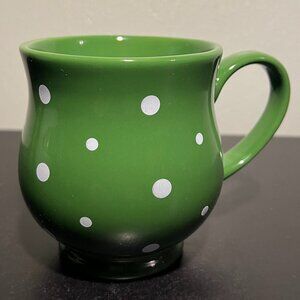 Add a fun and whimsical touch to coffee or tea time with a green with white polka dot mug from Temp-tations by Tara. A stylish, vintage mug with a classic, contemporary look has a large capacity, rounded middle, pedestal base, large comfortable easy-to-grip handle and a nice heavy feel to it. Oven, dishwasher, and microwave safe. Measures 4.75” tall with a 3.5” diameter; 5.5” across including handle. Holds 16 fluid oz.