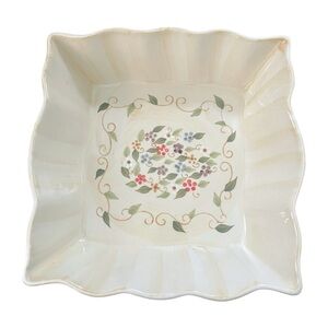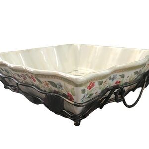Beautiful, classic, floral vintage style cookware set. Includes one large ceramic casserole dish, two matching trivets, and one floral bakers-metal tray for the dish.