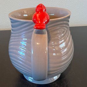 Bring rustic woodsy, nature vibes to your tea times or coffee breaks year round with this embossed wood tree ring pattern ceramic mug accented with a small red cardinal figure perched on the thumb rest of the handle. The bright red bird brings a stylish touch of color to this elegantly crafted, taupe gray-light brown wood grain textured, rounded mug. Microwave, dishwasher and oven safe. Measures 5” tall including the bird figure with a 3.25” diameter. Holds 16 fluid oz. Woodland pattern from Temp-tations by Tara.