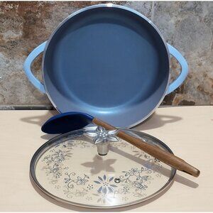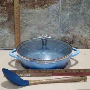 Temp-tations braiser with a lid and a serving spoon. The brand "Temp-tations" is visible on the side of the pot. Enameled cast iron braiser with an embossed snowflake design on the lid. Embossed snowflake design on the lid with a star-shaped knob.
