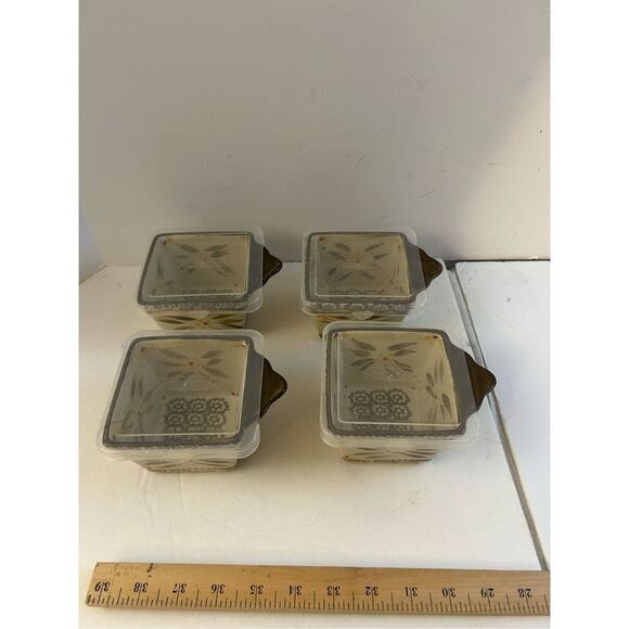 Temptations presentable ovenware & lids old world cubes 10 oz KFL-712696 brown cream. 4 sets with lids.