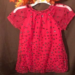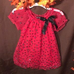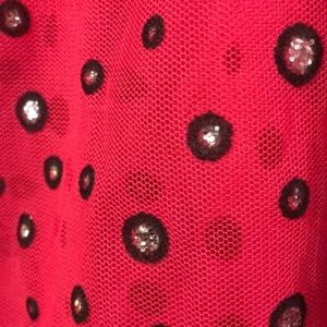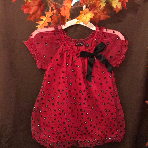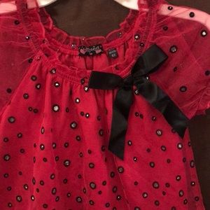 Tempted girls size 6x. Hot pink, short sleeve with circular black, and sparkling glitter sequence. Black bow.