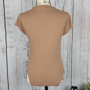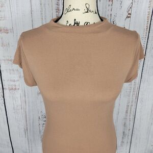 Item: Temt Women's Medium Caramel Brown Turtleneck Basic Chic Short Sleeve Bodysuit. Very pretty light brown color. Awesome for layering outfits! Material is lightweight and soft. Clean and classy style! Very figure flattering! Purchased at a local boutique.