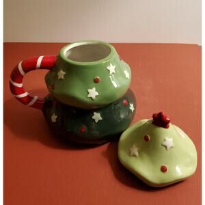 A charming stacked tree Christmas mug by Ten Acres Gifts, featuring three tiers of green boughs dotted with white stars and red ornaments. The candy cane striped handle adds a festive touch, and the star topped lid completes the whimsical holiday look. Bright glossy colors and a full sculptural shape make it perfect for display,cocoa station, or gifting.