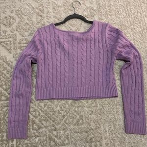 Ten Sixty Sherman Lilac Cardigan Size Med but is a bit cropped, which is cute with a blouse or t-shirt underneath. Mix of cotton 62% and Acrylic 38%. Simple fun sweater, wear year round, over the shoulders, to office or beach. Slightly used but no holes, or rips. No pet/smoke home.