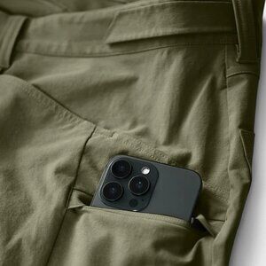 The waist tabs make it easy to get the perfect fit without a belt. The material is very stretchy, and the inseam is gusseted for better movement.