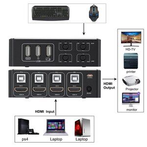 【HDMI 2.0 KVM Switch】: Implement a range of monitors, keyboards and mouse to control four PC host / game consoles with HDMI and USB ports. Save space, power, and device costs with this KVM switch. You can centrally control and manage multiple computers without having to move from one workstation to another