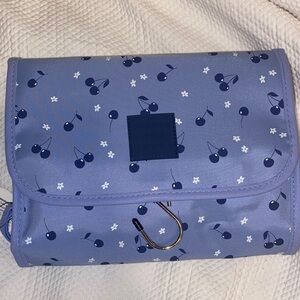 The Roll Up Bag unfolds into three roomy compartments, giving you the perfect balance of style and function. Simply hang it up to display your essentials neatly and within easy reach. Designed with a playful blue cherry print, this versatile bag is ideal for travel or daily organization.