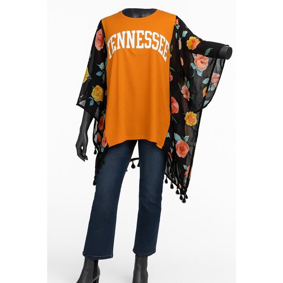 orange tee featuring sheer black floral kimono sleeves. Vibrant rose print with tassel fringe adds a boho touch while keeping team spirit alive. Perfect for game day, tailgates, or casual chic looks.