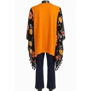• Sheer black kimono sleeves with yellow, coral & peach floral print