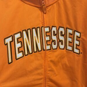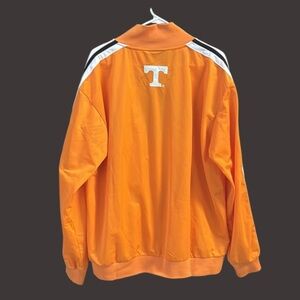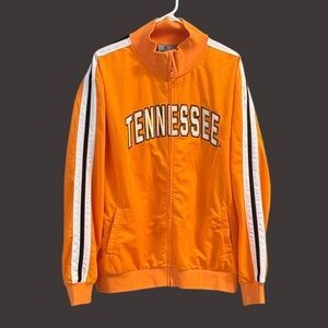 Vibrant orange track jacket with Tennessee lettering. Features white and black stripe details on sleeves.
