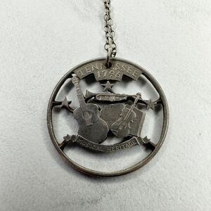 Such a unique and cool piece! This necklace features an actual Tennessee state quarter that's been artistically cut out to showcase the beautiful musical heritage design. You can see the guitar, violin, trumpet, and songbook that celebrate Tennessee's amazing musical history - so perfect for music lovers!