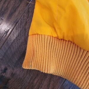 no size tag listed due to Reversible. orange is nylon. sleeve cuffs has some stains. gray side has small stain that I have pointed out in a photo. very heavy pullover.