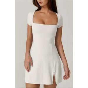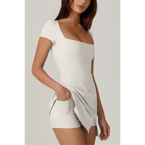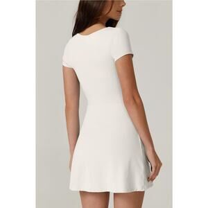 Feature:Fashion-forward and beyond functional, the athletic dress is made of super soft, stretchy Alosoft with short sleeve, a squareneckline, a snug fit through the waist, side slit and a mini-length A-line skirt.