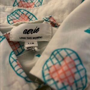 Charming lounge set with a tennis racket print. Features a button-up top and elastic waist shorts. Perfect for a cozy night in.